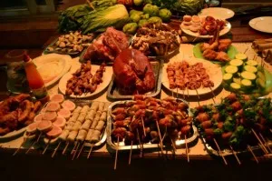 A lot of stalls are on the HamRong street of the 100-meter stretch. The interesting feature of these stalls is just selling the grilled-foods that make it called “grilled-food street’’. The demand of tourists may contribute to the appearance of these stalls. The grilled-foods are available in all regions of Vietnam, however, Sapa grilled-foods become the “unmistakable brand name’’. Tourists may not forget its taste when just try it one time. With the typical features of cool, clean and fresh climate, the Sapa grilled-food leaves the strong and deep impressions on the tourists with the unforgettable flavors. The stalls set up simply with small baskets of corn, sweet potato, cassava, or chunk of meat …, some plastic chairs and a coal stove on the roadside. In the chilly night, citizens and tourists sit around the charcoal fire to enjoy the grilled-foods. The thing is different from other places is that everything in Sapa can be made the grilled-dishes. Apart from corn, sugar cane, sweet potato and cassava, these can be grilled such as eggs, womb, sour tofu, round sticky rice cake…It may be listed to hundred of dishes that is hard to enjoy within one week. Each dish has its own spices, marinating style and flavors that make it unique and special. You hardly find out the repeat of the flavors. In the chilly climate, spicy foods may be the favorite one to warm up body. The most common dish here is skewers which are made by meat and mix of oil, chili powders and spice.